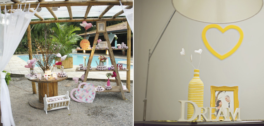 eu mandei fazer 30 corações, em MDF, com um furinho na ponta para colocar as fitinhas. usei como parte da decoração do chá, só que as fitas eram amarelas, e depois usei no casamento, com fitas rosadas.