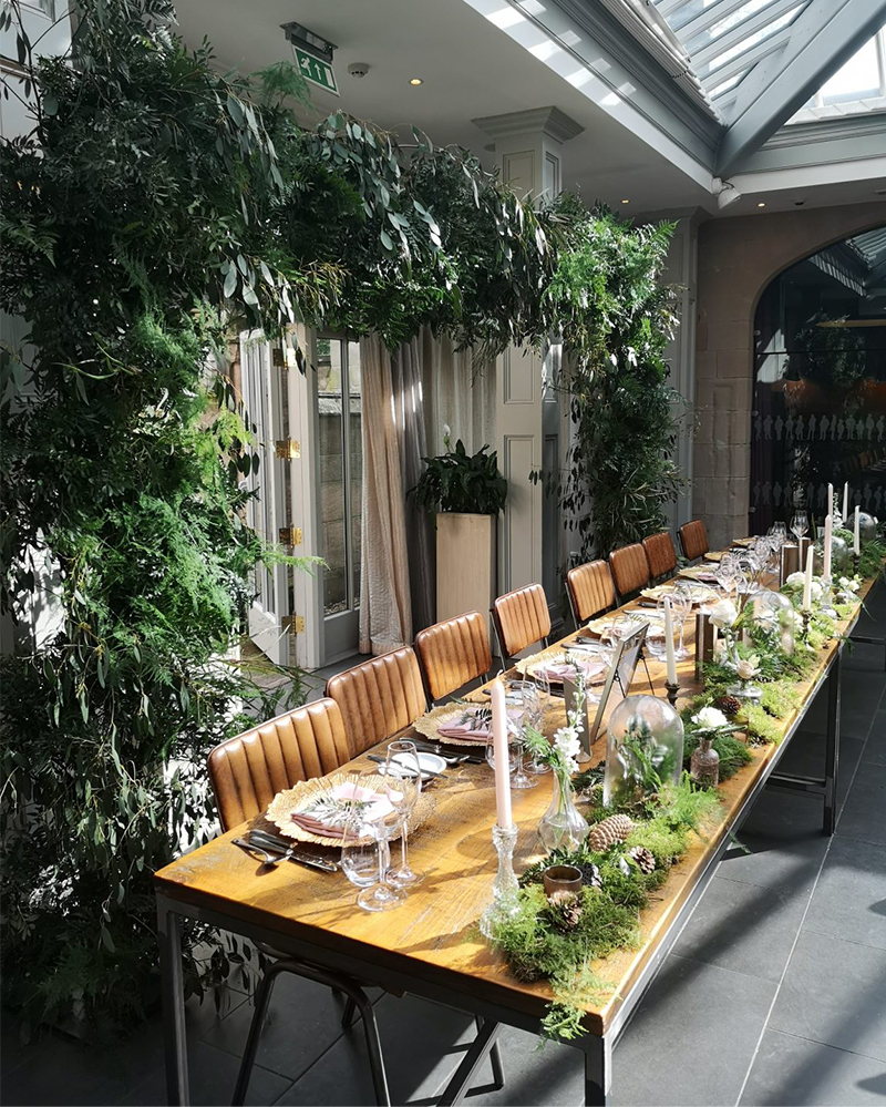 A folhagem, além de uma maneira barata de criar belos arranjos decorativos, traz a natureza para os ambientes fechados. Já estamos vendo muitas paredes verdes como backdrop em casamentos, né? Adicionar instalações e objetos geométricos podem criar um contraste interessante.