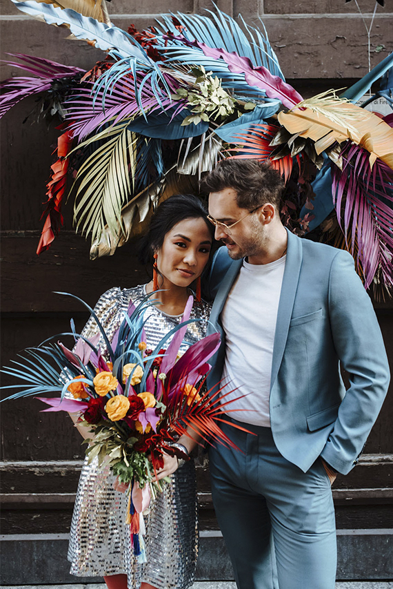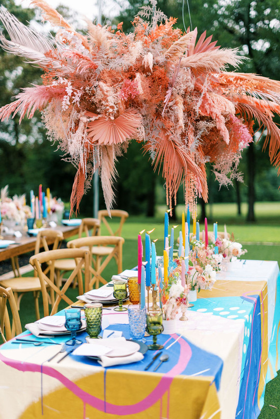 Os casais estão se inclinando para casamentos mais ousados e coloridos, evitando brancos e nudes. Eles estão incorporando todos os tipos de cores alegres e cheias de brilho em seus artigos de papelaria, decoração e gastronomia.