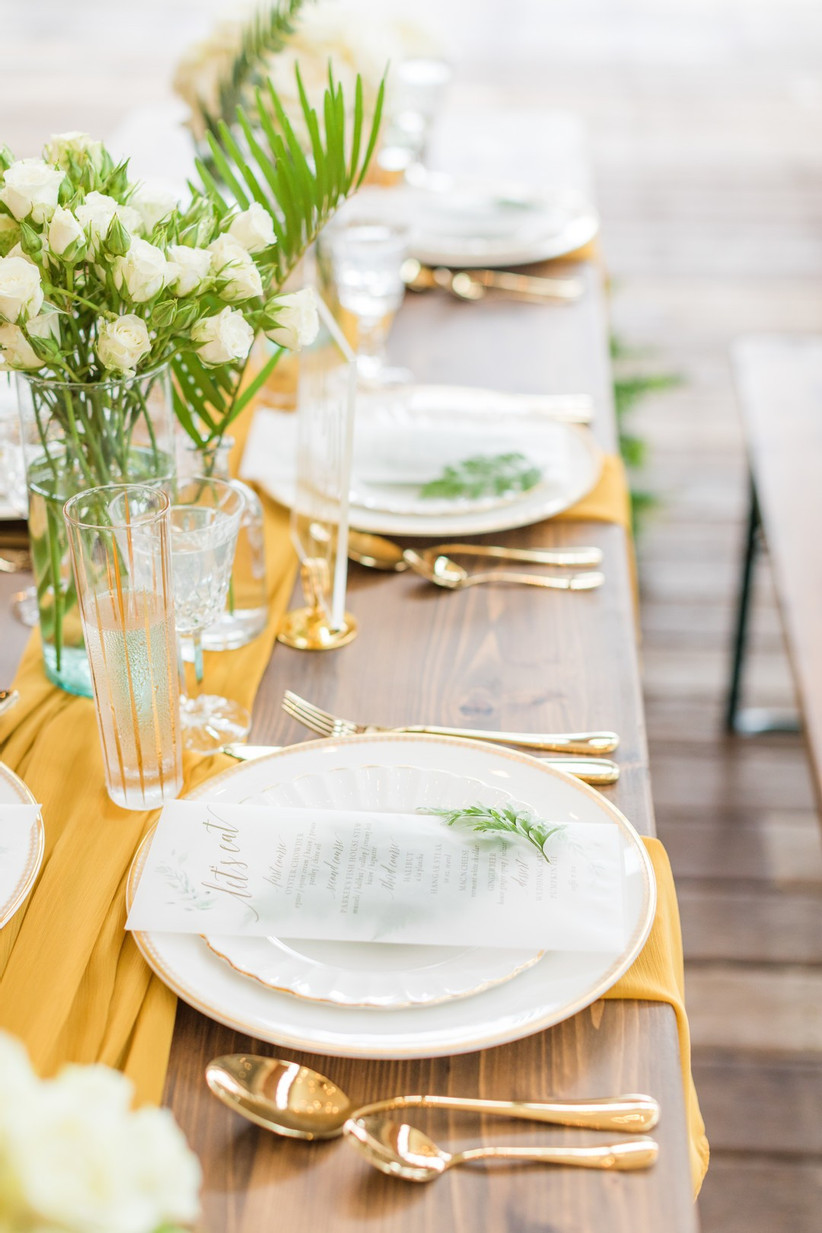Na decoração do espaço do casamento, adicione textura e estampas. Isso pode acontecer nos vasos e centros de mesa, alcançando um toque orgânico com passadeiras ou toalhas de mesa de linho ou algodão combinados com louças naturais e pratos de cerâmica rústicos.