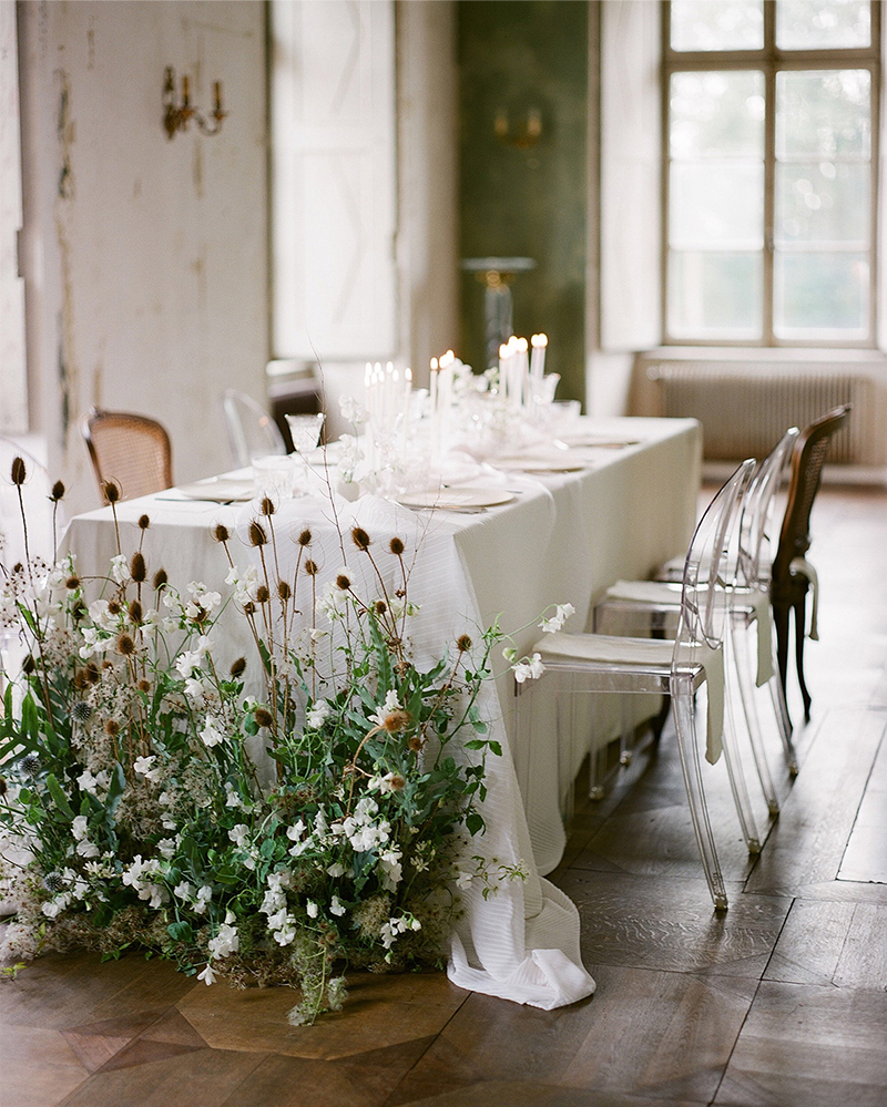 Linhas limpas, clean e contrastes entre materiais são a chave do sucesso nesse tipo de decoração. Objetos com design moderno (como as cadeiras Ghost de acrílico) e arranjos florais mais conceituais adicionarão texturas interessantes em oposição às arquitetura rústica do espaço.