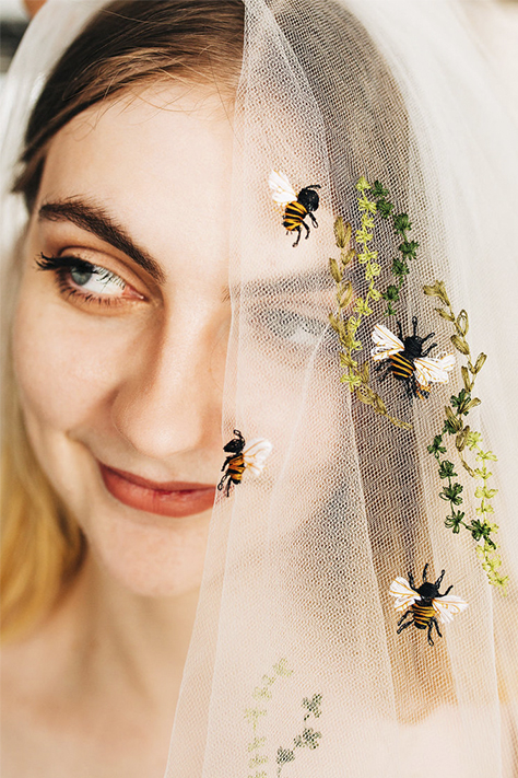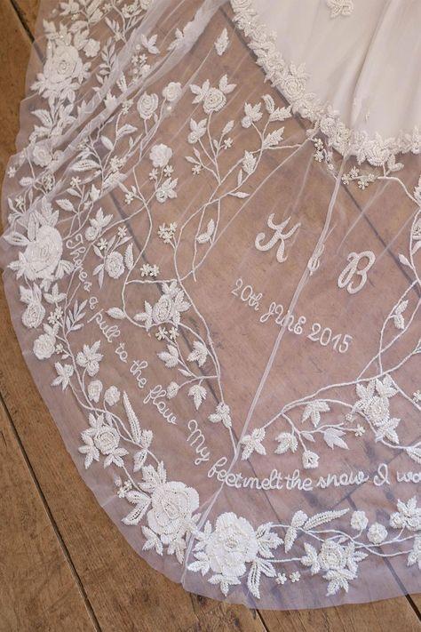 Véus longos e cheios embelezados com bordados, personalizados e sob medida serão o foco do look da noiva. Eles incluem iniciais com monogramas, emblemas, símbolos específicos, mensagens secretas –como frases ou trechos de poemas- ou as flores favoritas da noiva bordadas em tule de seda ou 3D. O céu é o limite para embelezar ainda mais os véus.
