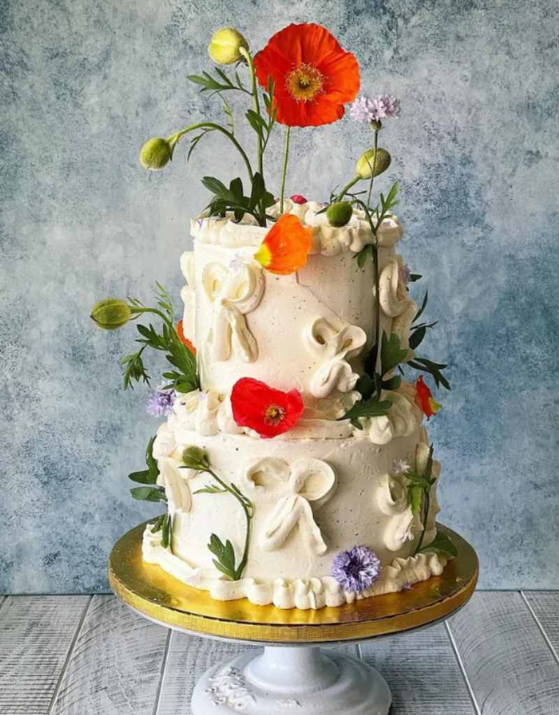 Acabamos de citar acima que as flores estarão por todos os lados nos casamentos em 2024, prova disso são os bolos que também serão mais do que nunca adornados com flores frescas. Entretanto, as flores serão adicionadas à sobremesa de forma bem orgânica, remetendo a um verdadeiro jardim que não segue um padrão ou forma definida.