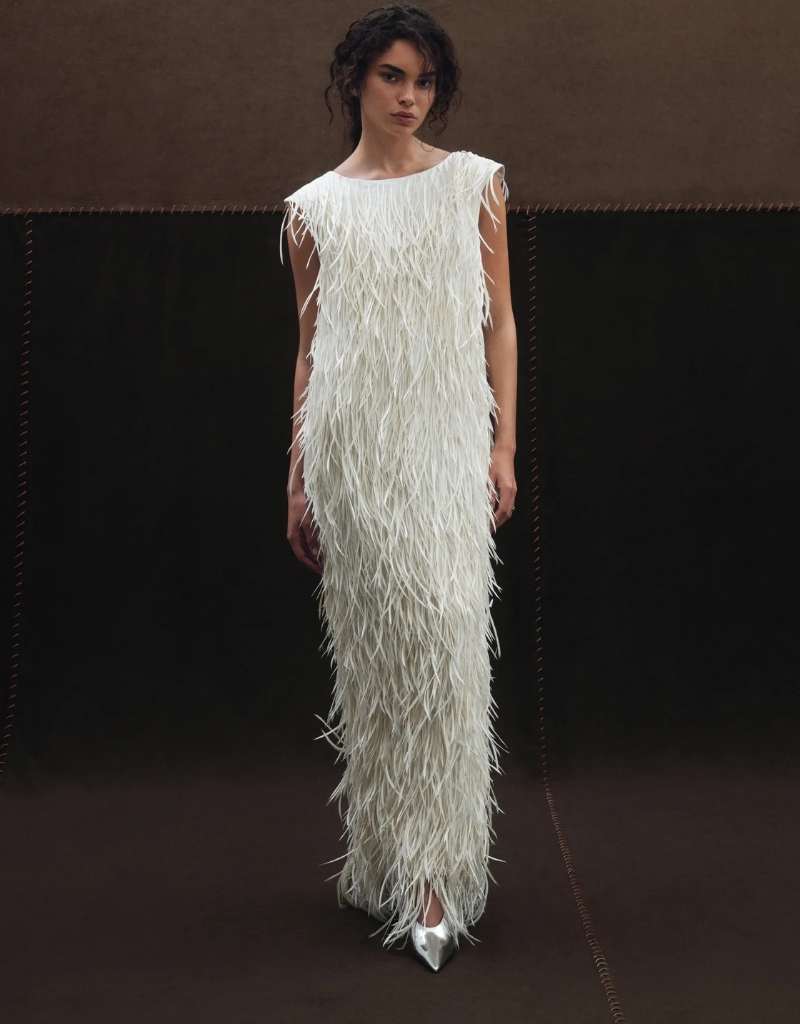 Os designs exploram silhuetas minimalistas com camadas inclinadas, pregas, texturas delicadas e corpetes assimétricos.