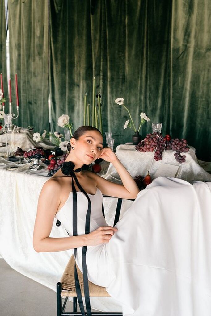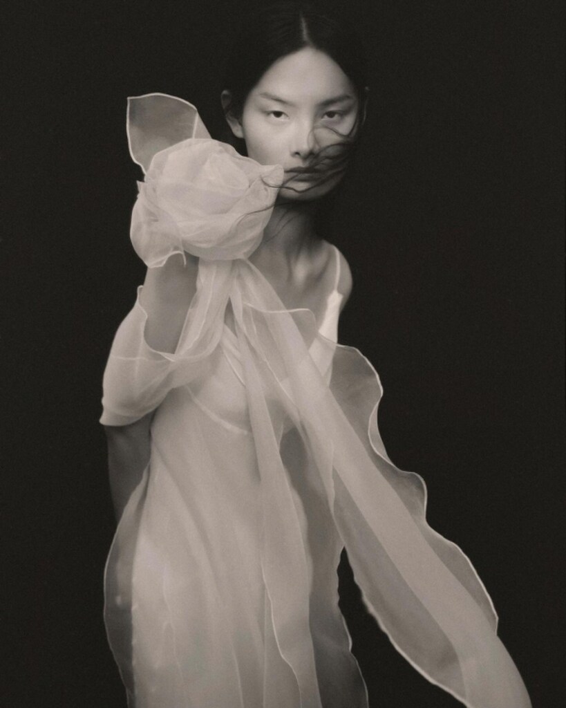 Os designs exploram silhuetas minimalistas com camadas inclinadas, pregas, texturas delicadas e corpetes assimétricos.
