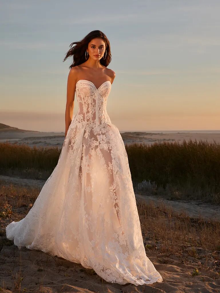 Por exemplo, uma noiva pode começar o dia com um vestido dramático, longo e com cauda, e depois trocar facilmente para uma versão mais curta e descontraída para a festa, ou remover camadas, como mangas e saias, para maior conforto, mantendo o estilo.