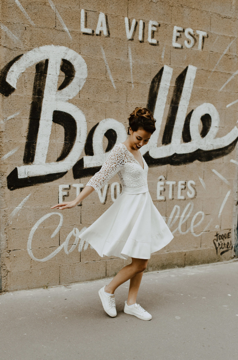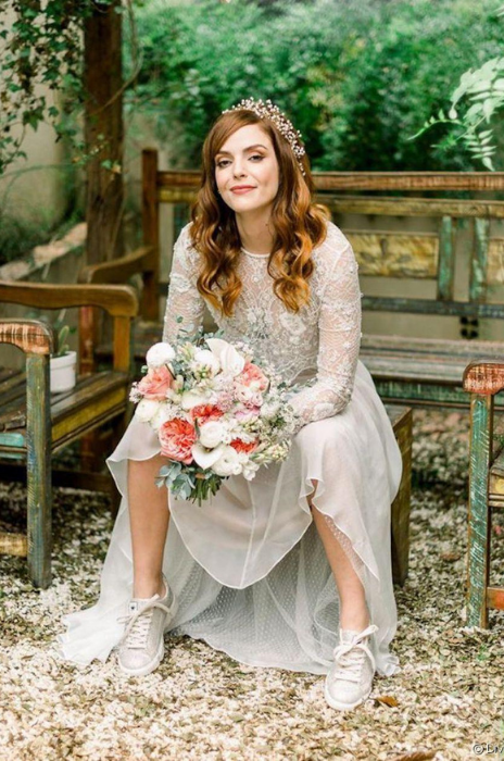 Uma dica é equilibrar os detalhes, como um vestido sofisticado com um tênis de noiva muito esportivo.