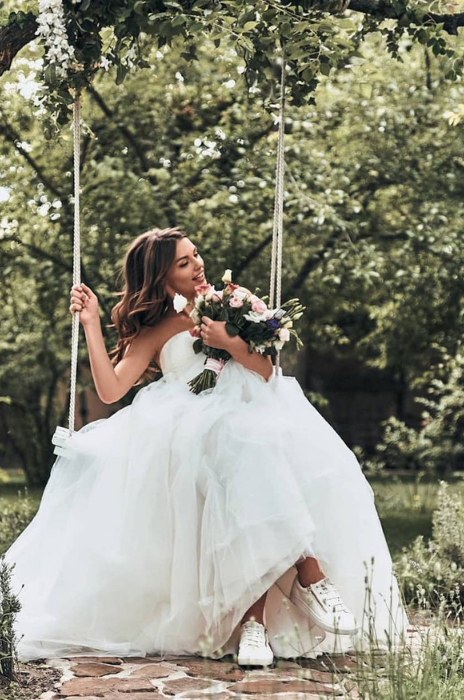 Juntamente com o toque despojado, o tênis para noivas é uma boa alternativa para ser usado somente na festa ou outro momento que a noiva preferir. Seja no casamento ao ar livre, jardim ou em casa, que tenha uma vibe mais intimista.