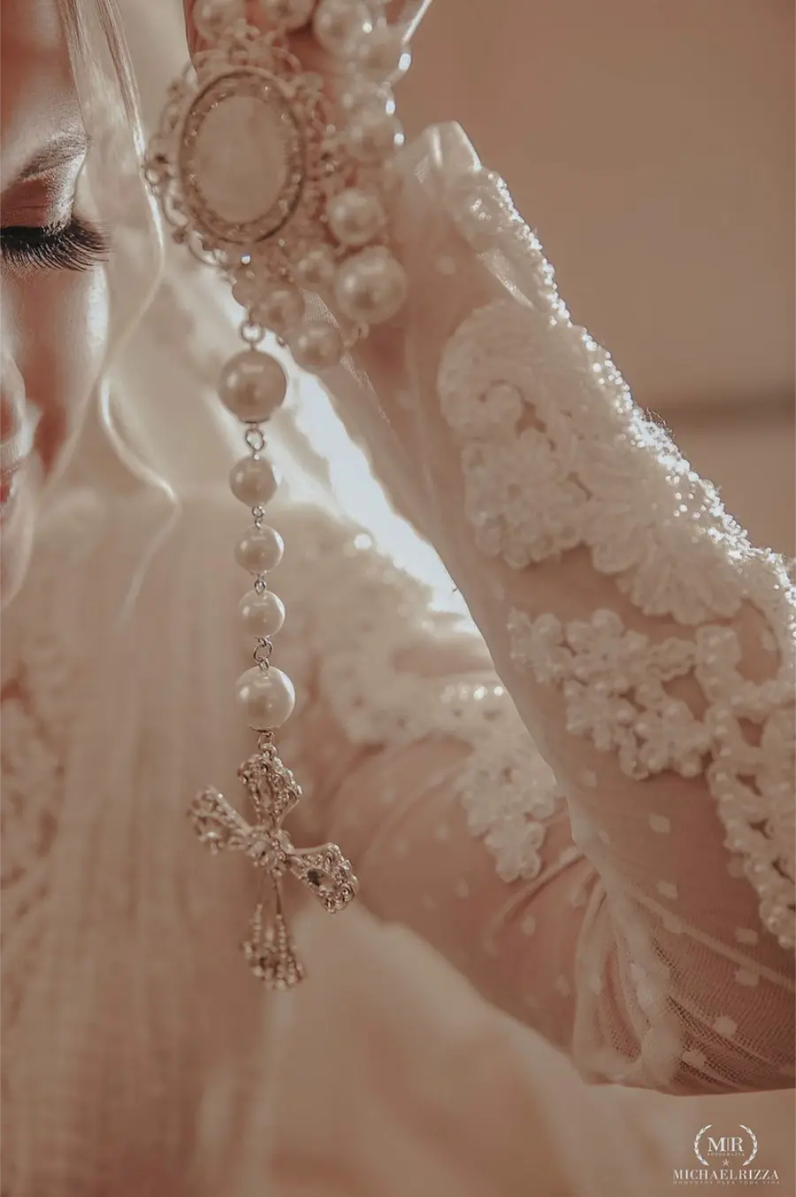 Nele, além das contas e do crucifixo, há um pequeno relicário que pode abrigar a foto de um ente querido, como uma forma de manter alguém especial presente no momento do casamento, mesmo que não esteja fisicamente ali.