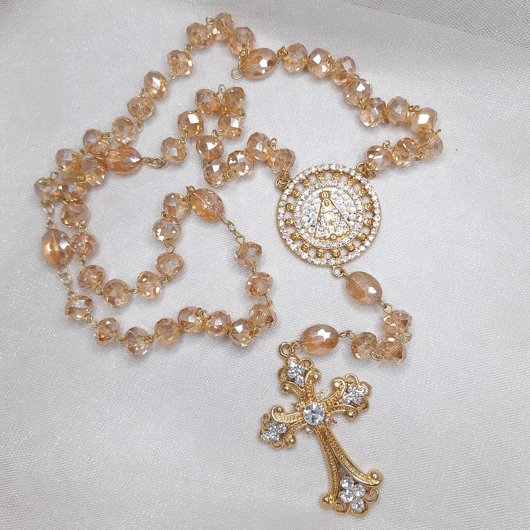 Esse modelo se destaca pelo brilho, sendo uma opção sofisticada. É ideal para noivas que querem que o terço também funcione como acessório de destaque nas fotos.