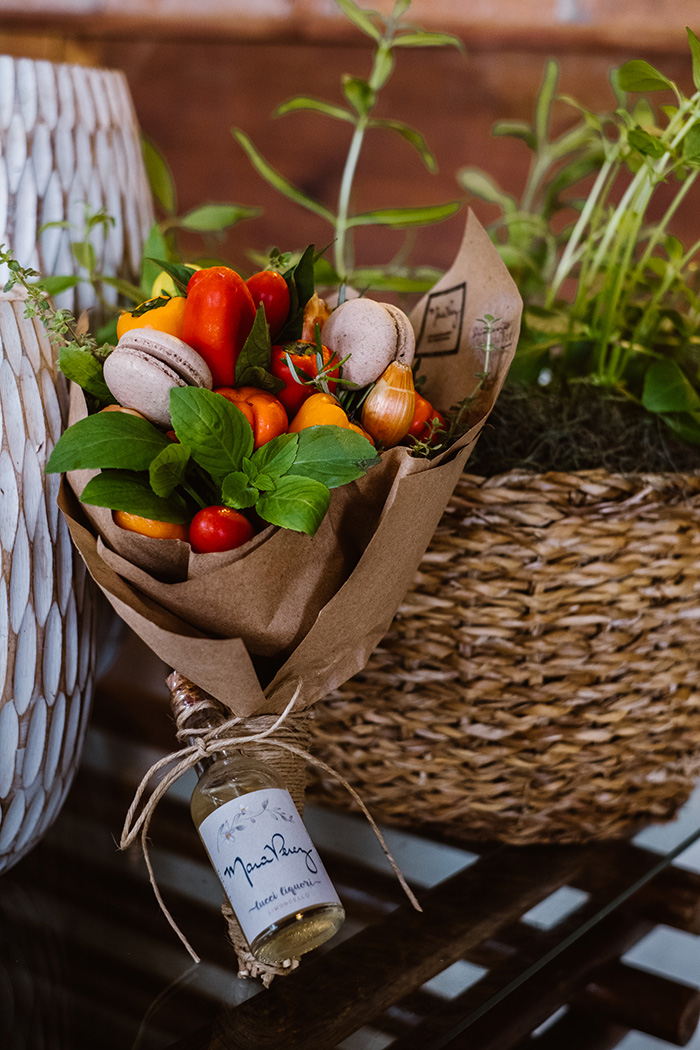 Uma pausa especial para falar da lembrancinha! Era um buquê com todos os elementos da decoração e gastronomia que estavam no almoço: nele havia ervas, macarons, mini cebolas, tomatinhos e pimentas. Era de uma delicadeza só!