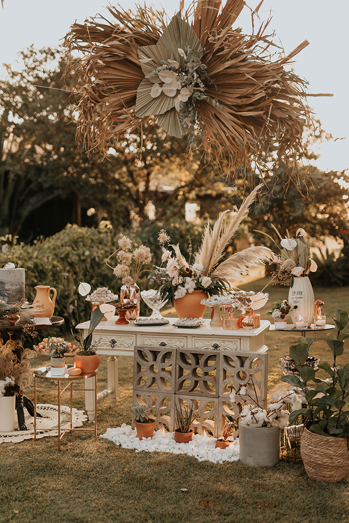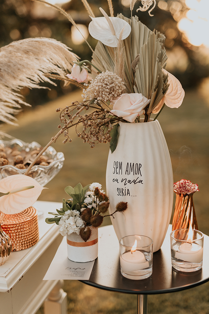 Uma das partes do projeto que mais marcou foi o muro de cobogó de concreto montado na mesa doces. “Ela sabia que nós amávamos concreto e nos surpreendeu destacando ele na mesa de uma forma inovadora. Sem falar do buquê! Eu não havia encontrado nada no Pinterest que descrevesse o que eu queria, mas ele ficou exatamente como imaginava. Chorei muito quando peguei ele nas minhas mãos.”