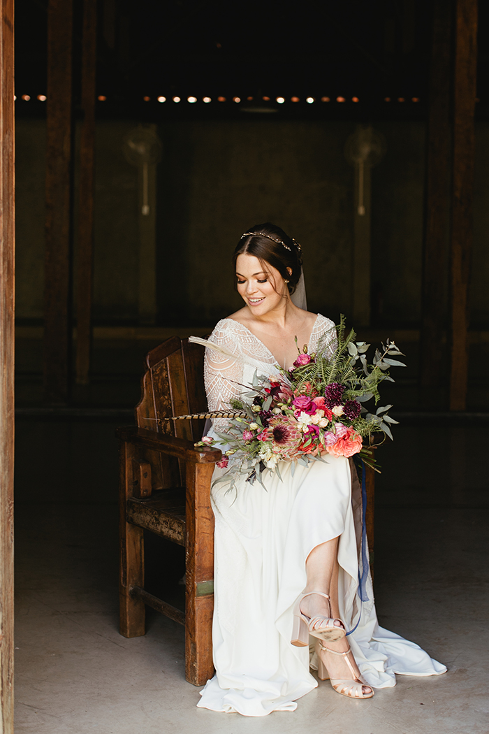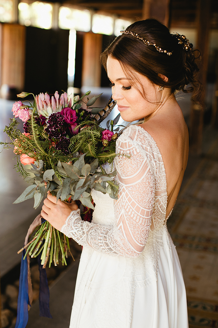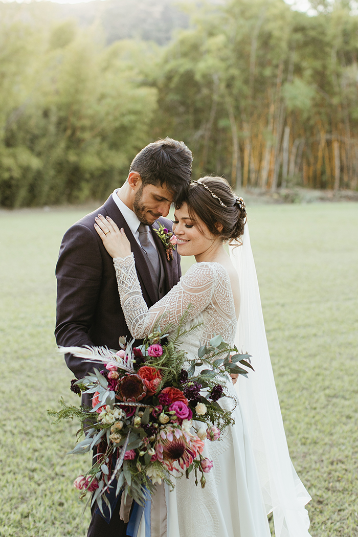 - O buquê da Fran com protea, penas e folhagens.