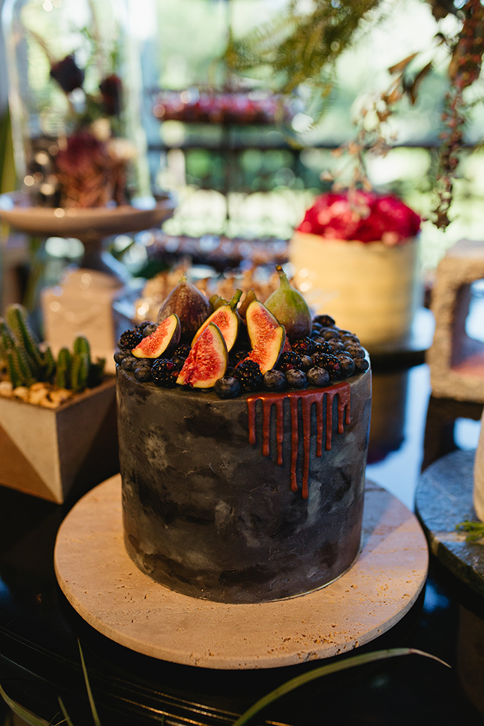 - O bolo preto decorado com figos e amoras.