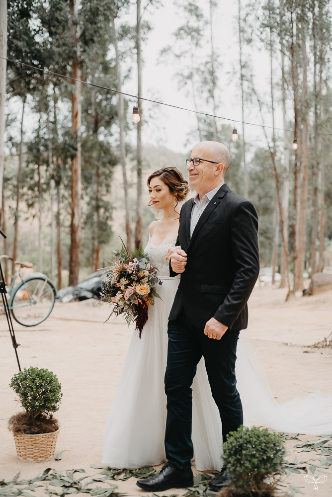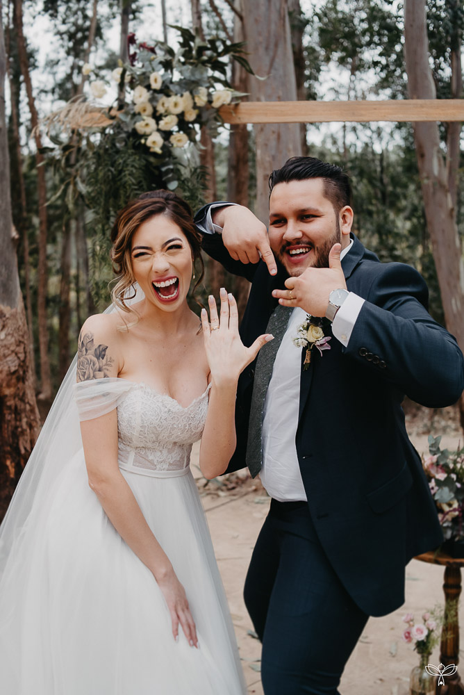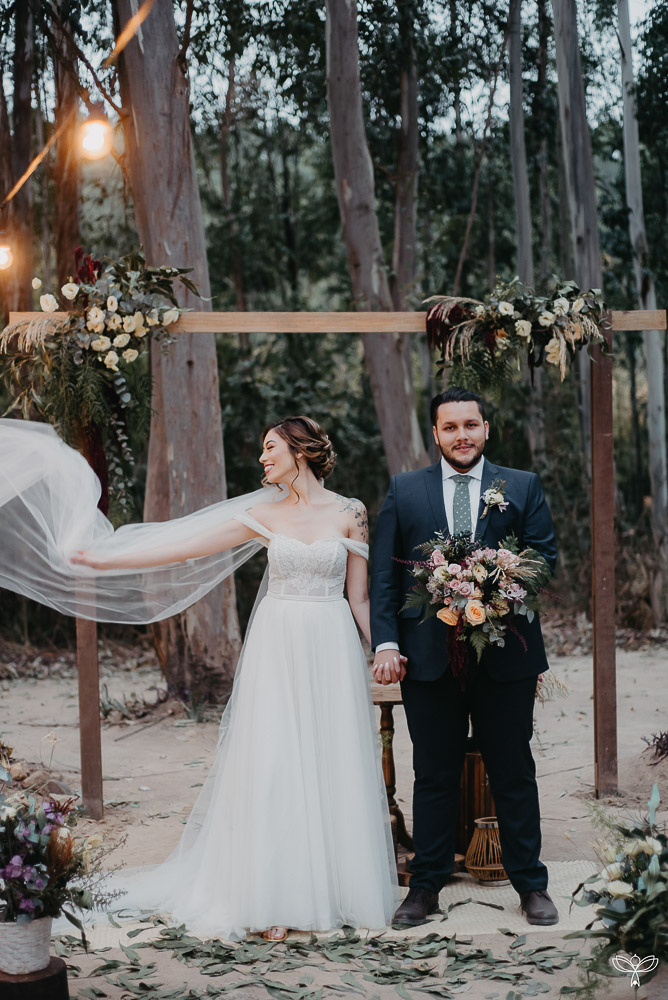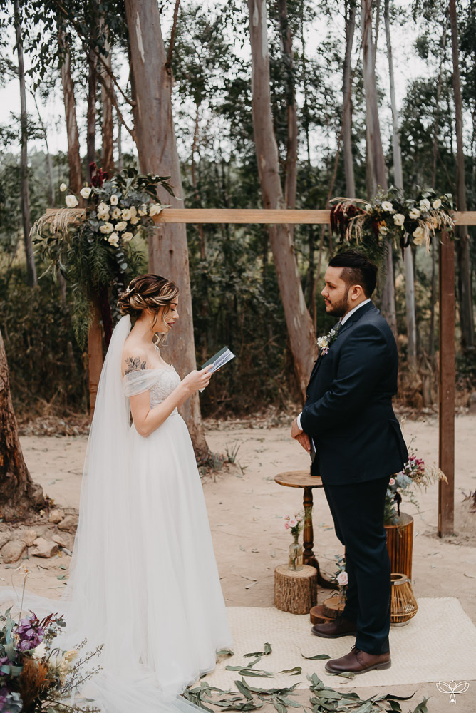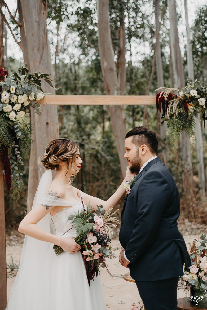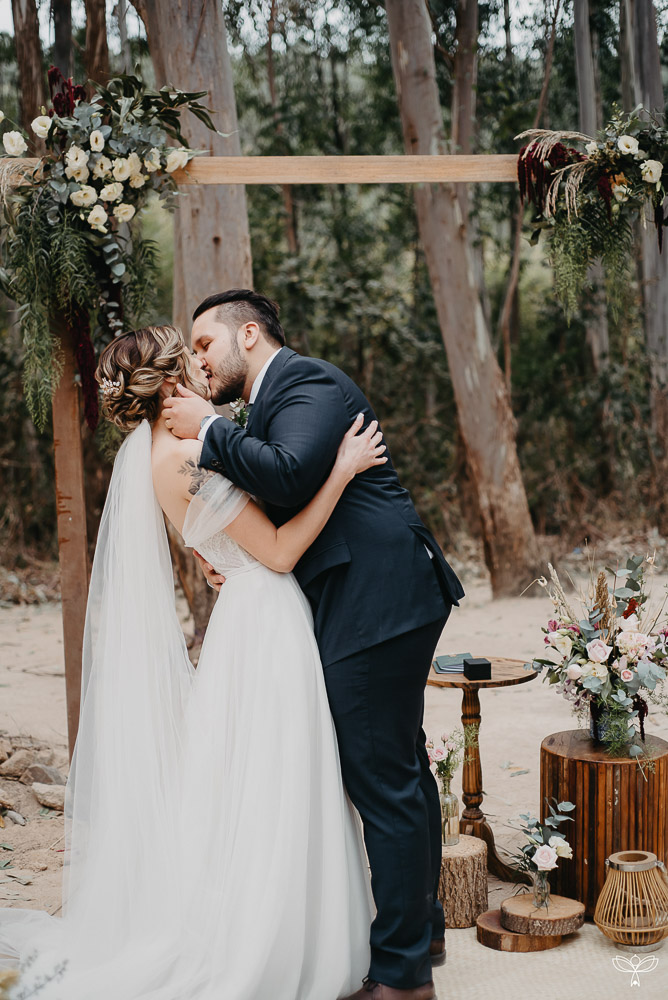 Escolheram dizer SIM no meio da floresta, sob o esplendor da natureza numa tarde encantada. Para harmonizar com o espaço, escolheram uma decoração rústica, em tons de branco, pastel, verde, marsala e azul.