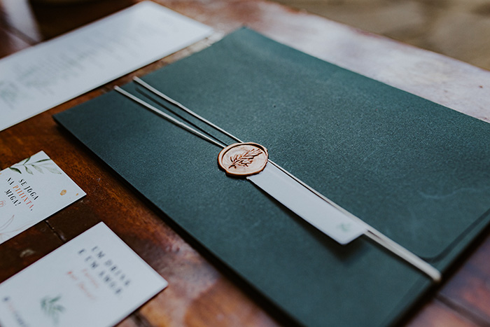 O convite, identidade visual e todo o restante da papelaria foram feitos pelo Renato, que é designer. Os dois fecharam todos os envelopes com um sinete e tags.