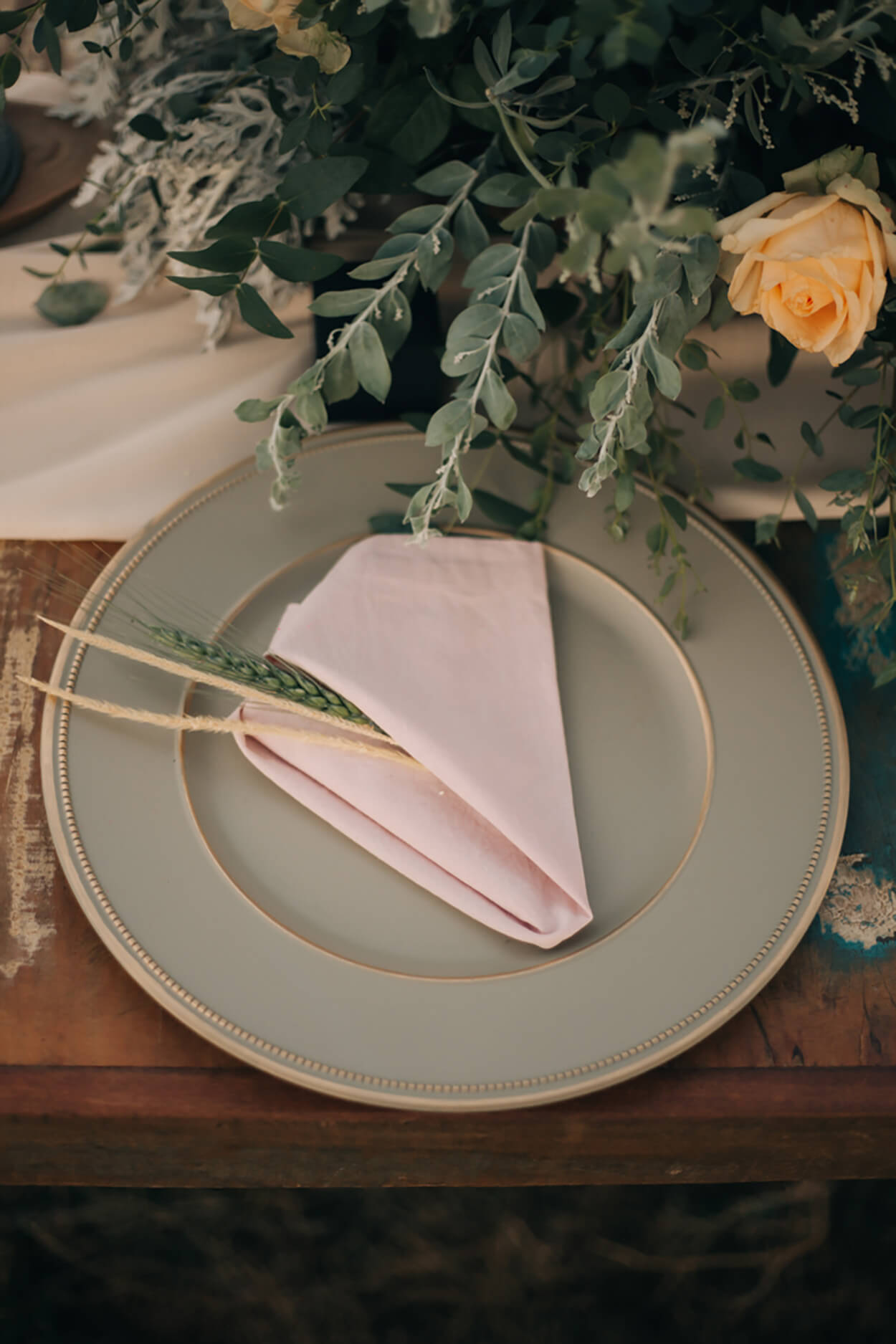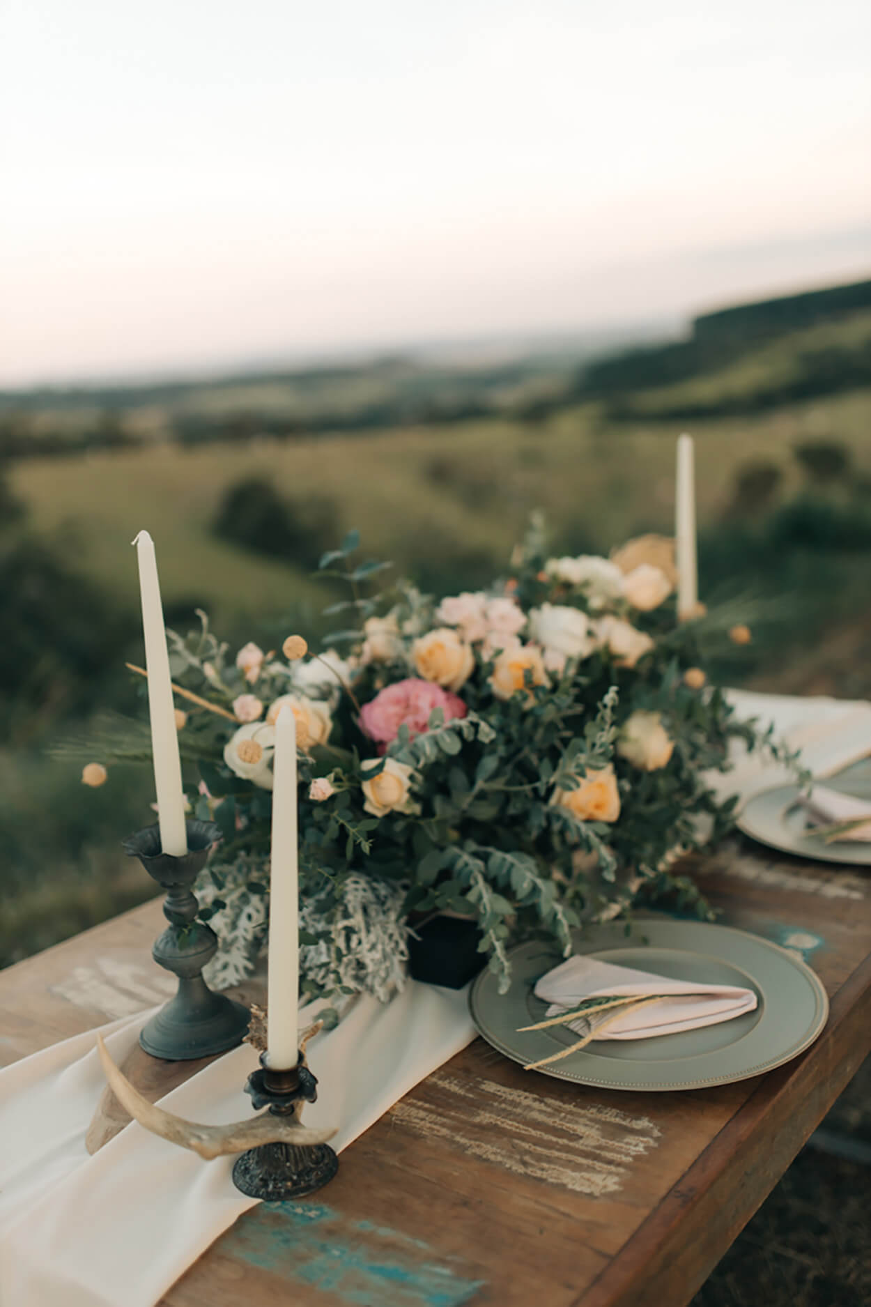 É aqui que nós podemos ter a confirmação do estilo! Rosas, velas, madeira e uma paleta clarinha. O altar traz apenas um arranjo de flores bem romântico no topo, deixando ainda mais os noivos em evidência. Fora isso, entram em cena apenas as mesinhas rústicas e um tapete étnico bem folk.