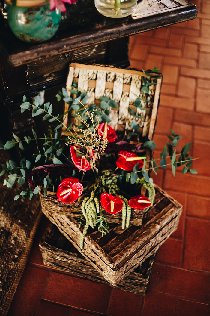 A cerimônia teve uma decoração mais tradicional e seguiu cores claras. Já a festa teve uma decoração tropical com arranjos em cores vibrantes nos tons verde, vermelho e roxo, combinando com a tiara e buquê da noiva. A recepção, no jardim em frente a piscina tinha mesas banquete, sem lugares reservados, arranjos tropicais e varal de lâmpadas sobre as árvores.