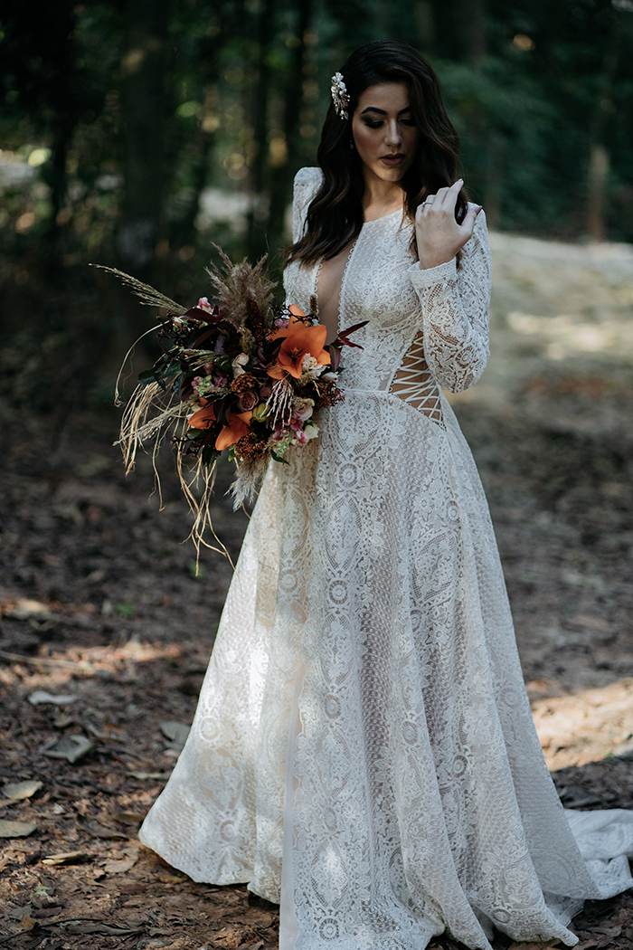 O pedido da Fabi para a produção foi: “faça o compilado de referências com o seu gosto, como você casaria, confio no seu bom gosto e sei que você gosta de coisas diferentes, e eu quero fazer exatamente algo diferente do comum”. Então ela pirou! Na hora pensou no estilo Folk, uma noiva de bota, com chapéu, vestido e decoração boho. Criou uma pastinha de inspirações no Pinterest e no Instagram e mandou para a equipe.