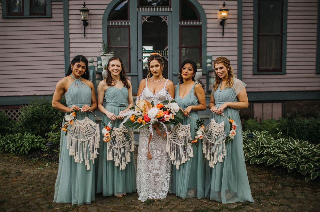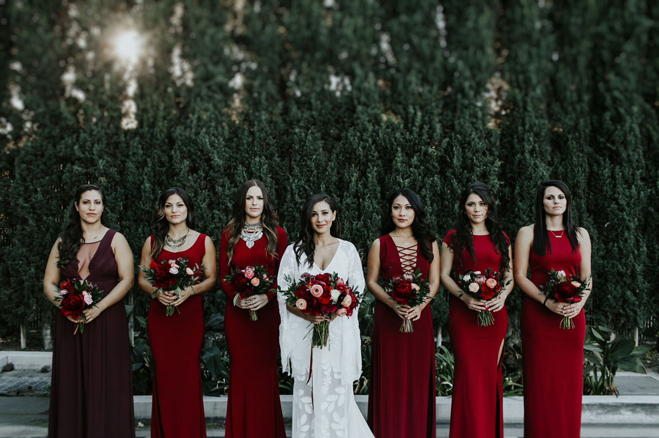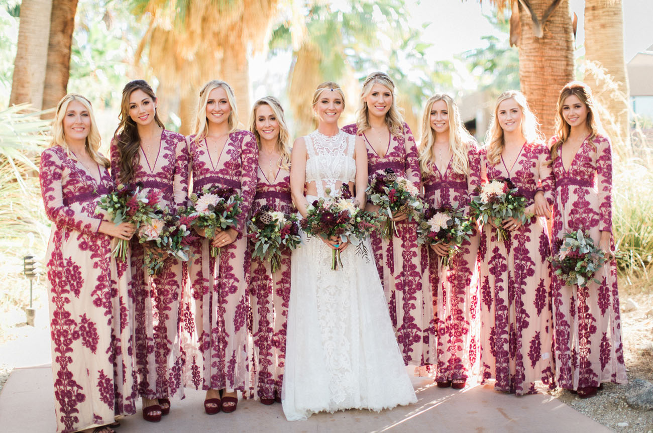 Mas nos casamentos gringos, as madrinhas adoram usar vestidos iguais e isso já virou tendência por aqui. Então essa é a opção perfeita para harmonizar com a decoração e o altar.