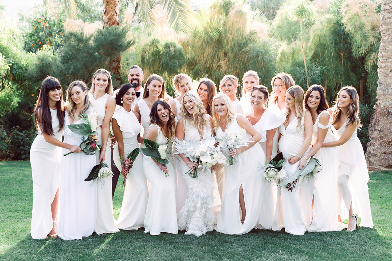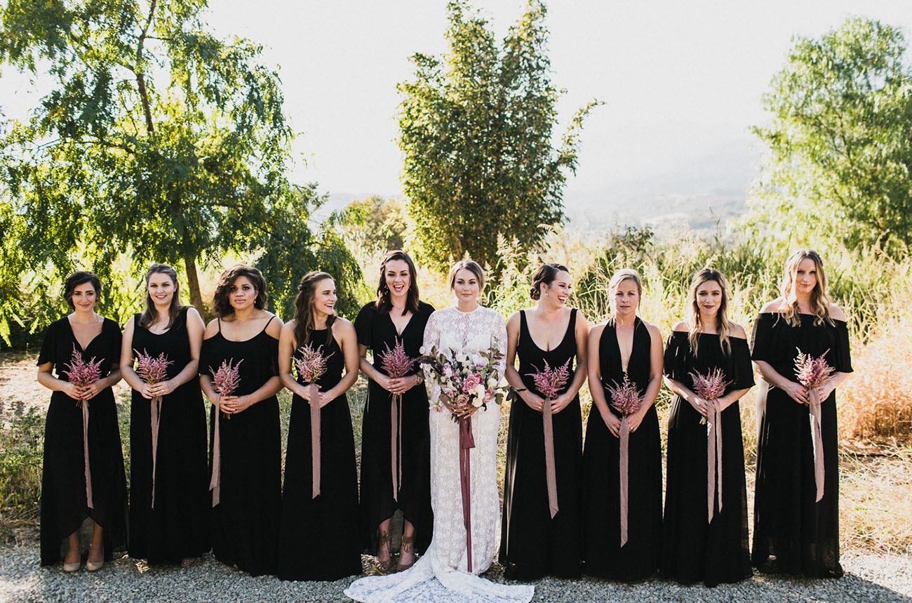 É muito comum a noiva indicar somente o estilo de traje e o comprimento. O que dá liberdade para que cada uma se expresse e fique à vontade.