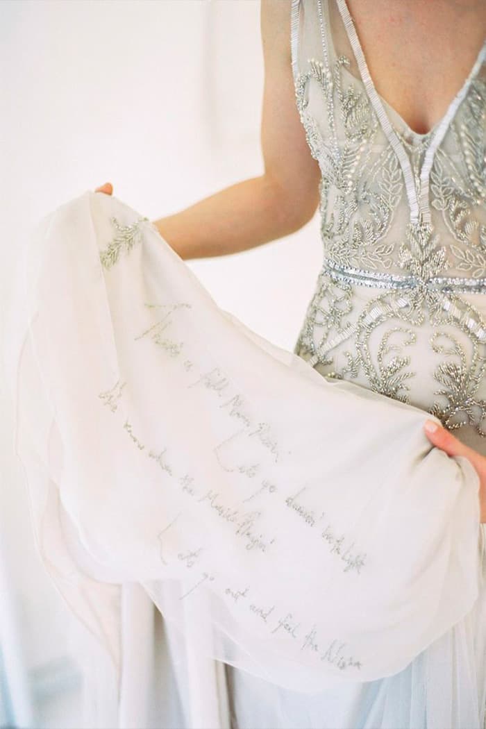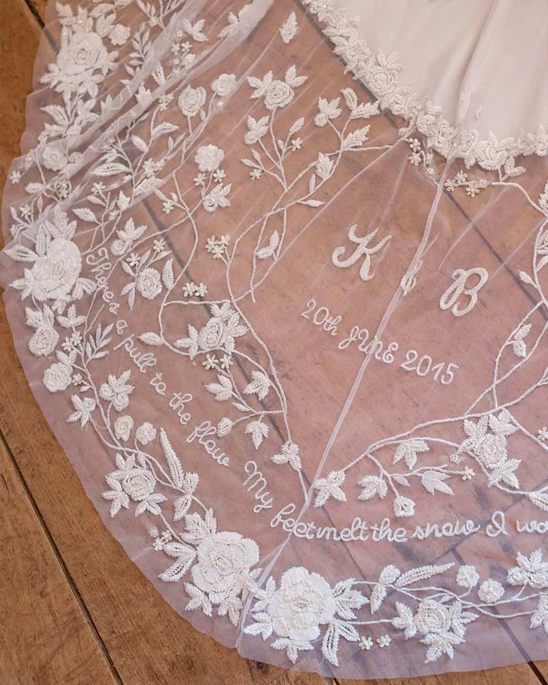 Em 2019, Hailey Baldwin usou um véu catedral bordado com as palavras “Till Death Do Us Part (Até a que a morte nos separe)”. Em 2020, veremos o boom dessa tendência dos bordados personalizados contando, de maneira exclusiva, a história de amor dos noivos. Pode ser qualquer coisa que tenha um significado especial, de versículos da Bíblia, data e nome dos noivos, poemas até uma mensagem de amor.