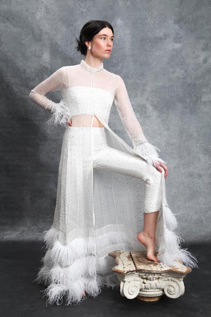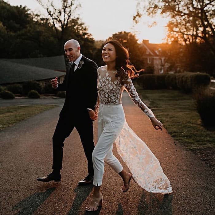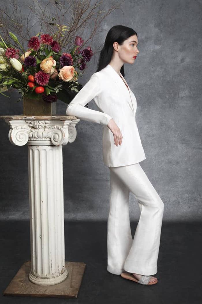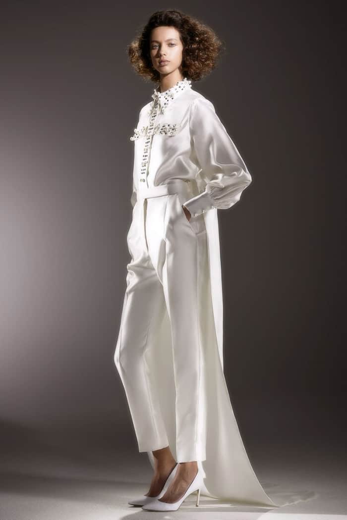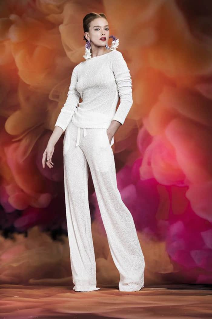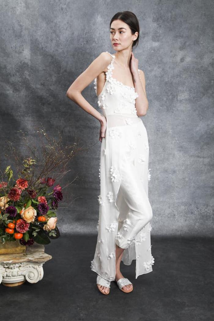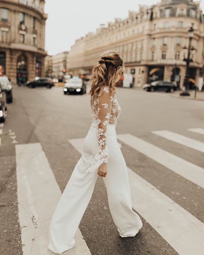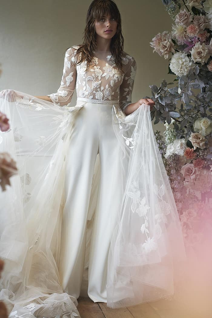 Os jumpsuits (macacões) estão em todos os lugares e eles abriram as portas para todos os tipos de calças e suas combinações! Essas alternativas para vestidos de noiva são confortáveis, elegantes e modernas. Bônus: em 2020, detalhes de renda, enfeites florais em 3D e miçangas metálicas deram aos ternos e macacões brancos clássicos um UP contemporâneo e romântico.