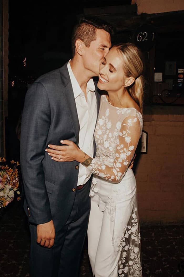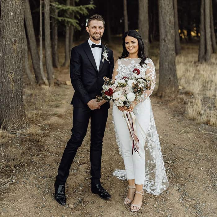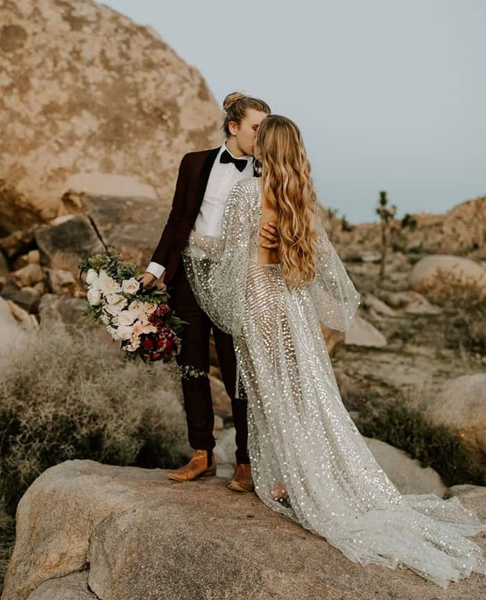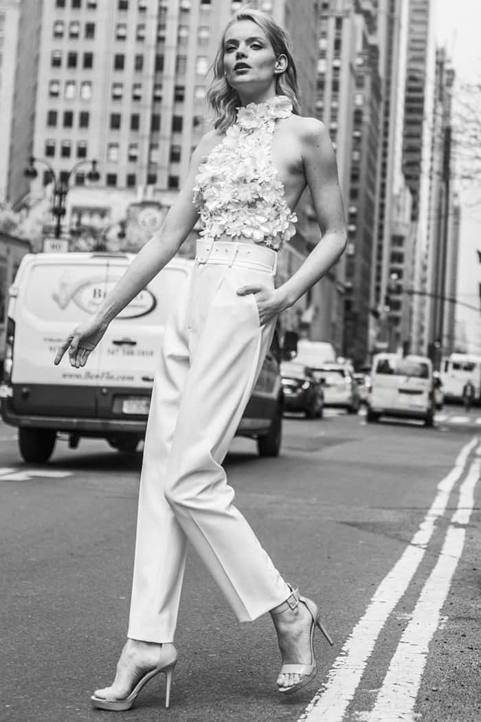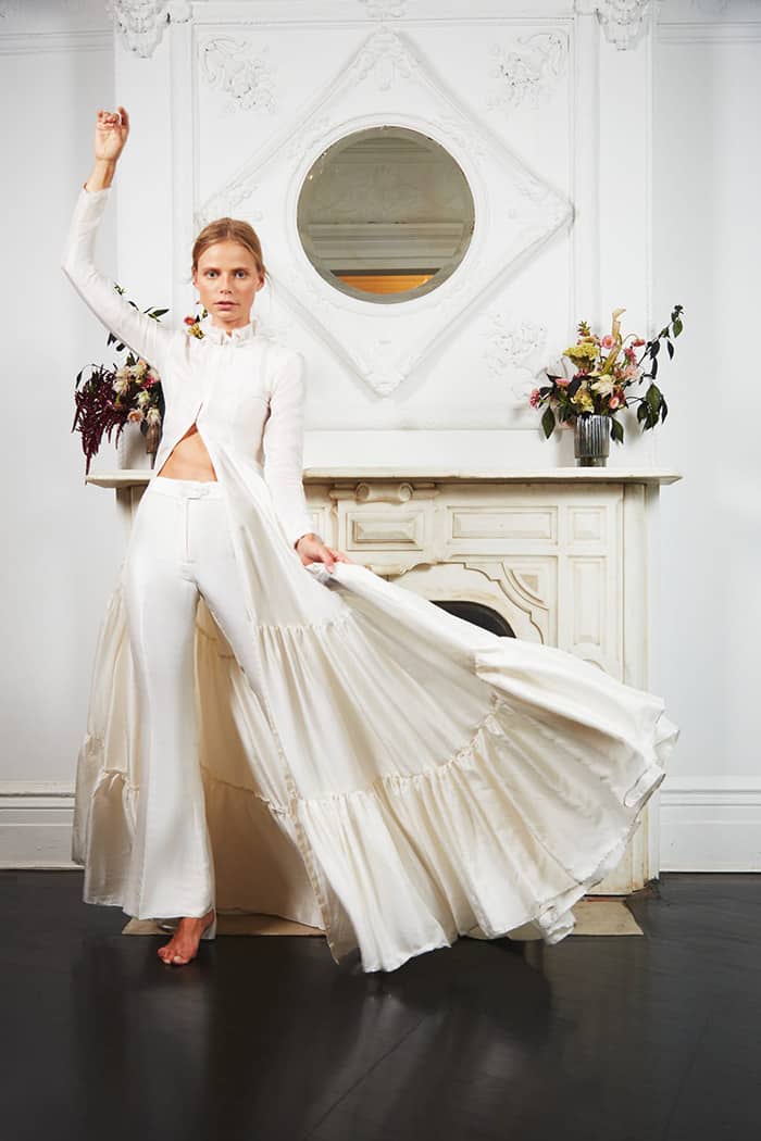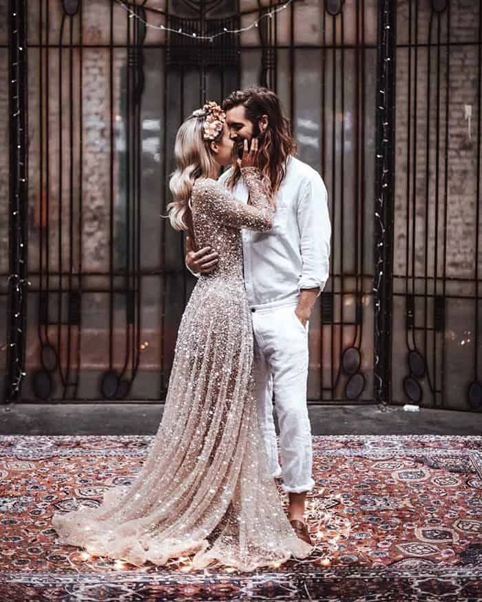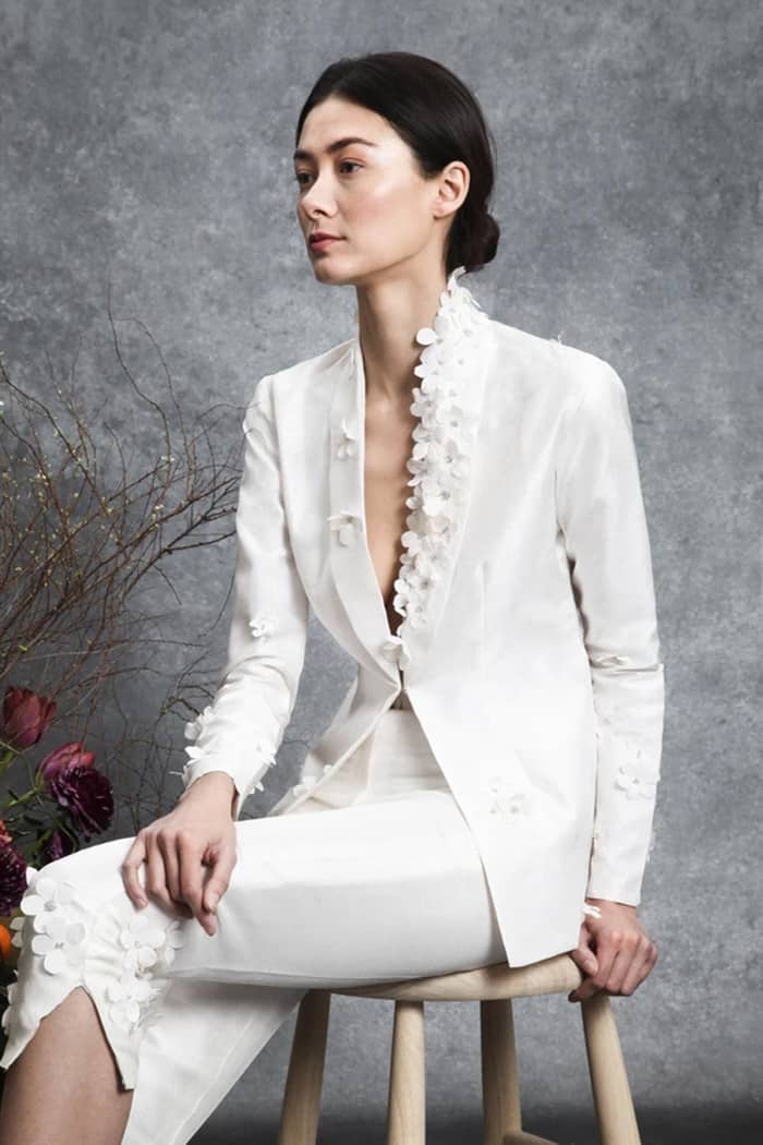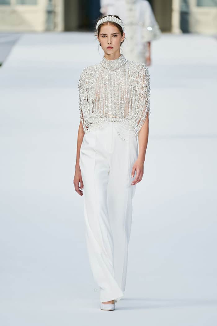 Os jumpsuits (macacões) estão em todos os lugares e eles abriram as portas para todos os tipos de calças e suas combinações! Essas alternativas para vestidos de noiva são confortáveis, elegantes e modernas. Bônus: em 2020, detalhes de renda, enfeites florais em 3D e miçangas metálicas deram aos ternos e macacões brancos clássicos um UP contemporâneo e romântico.