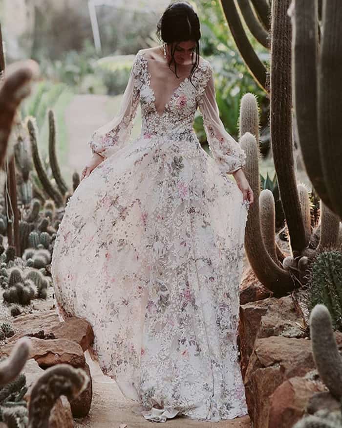 Embora motivos discretos e inspirados na natureza, como rendas florais e detalhes botânicos não sejam novidade no que diz respeito à moda para vestidos de noiva,com tanta delicadeza no ar esse ano nada mais natural do que vermos muitos vestidos estampados ou bordados, multicoloridos com os temas florais. Sejam sutis e pastéis, ousados e em grandes proporções, ou ainda na forma de bordados- incluindo os 3D-, essa maneira refrescante de usar flores deixa qualquer silhueta dos vestidos de noiva mais interessante.