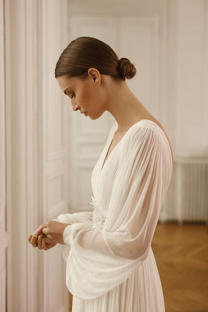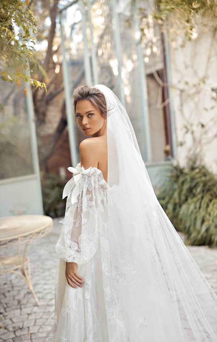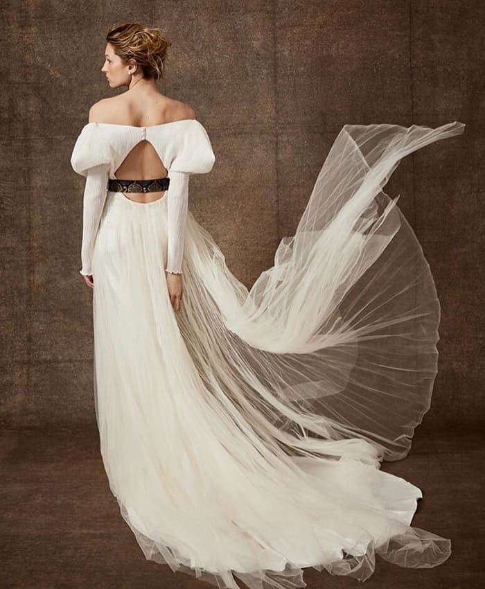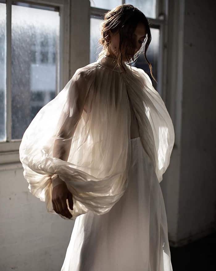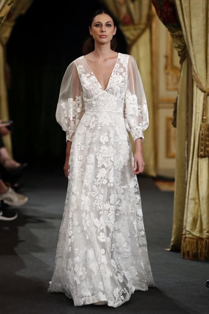 Muito forte também estão as mangas volumosas, cortesia dos anos 80, mas numa versão muito longe das mangas que a princesa Diana e outras noivas da era maximalista usaram. Essas versões, batizadas de mangas de poeta (poet sleeves) – por causa das camisas da era vitoriana, lembram do filme Shakespeare in Love? – com babados ou frisos e ombro a ombro resgatam o romance de uma pintura renascentista. Se você gosta desse detalhe, mas está preocupada em ser muito exagerado, procure uma silhueta esbelta com mangas bufantes e mantenha o resto de seus acessórios simples.