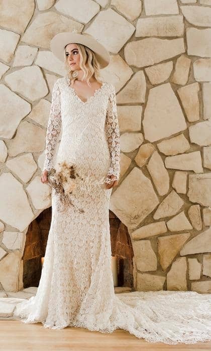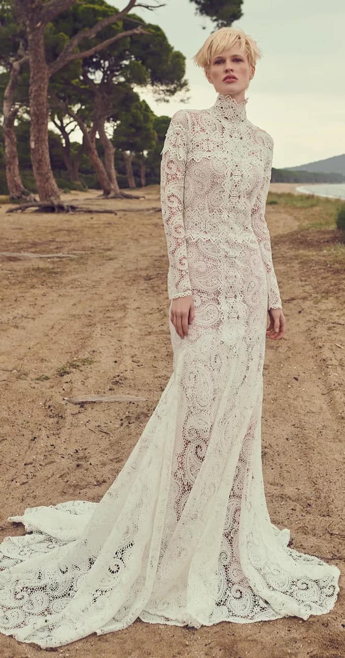 Esta tendência cai super bem no estilo boho. Vimos rendas de crochê em vários vestidos de mangas compridas e até algumas opções de gola alta. A renda de crochê é uma aplicação da arte do crochê. Geralmente, ela usa linhas mais finas e estilos de costura mais decorativos. A variação do tamanho dos furos também dá à peça uma aparência “rendada”.