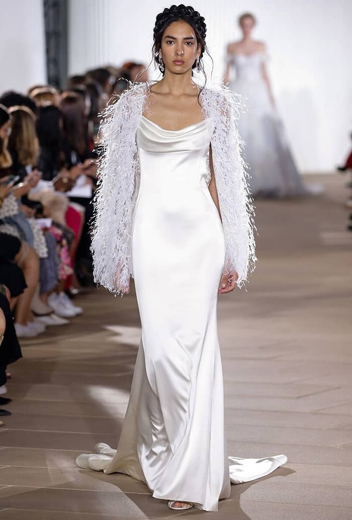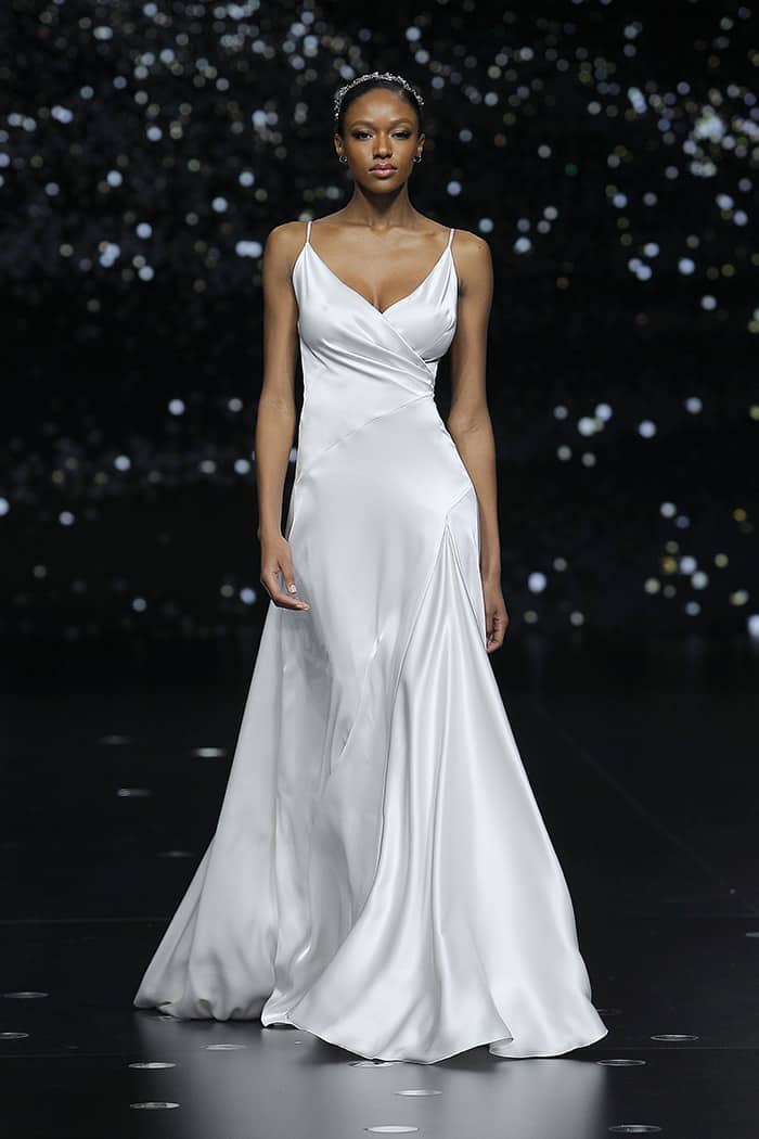 Mais uma novidade em tecido, a volta do cetim em vestidos de noiva. Essa é mais uma inspiração dos anos 1920 e 1930 das glamurosas atrizes de Hollywood que deixavam todos hipnotizados nas telas de cinemas com seus vestidos em moulages elegantes.