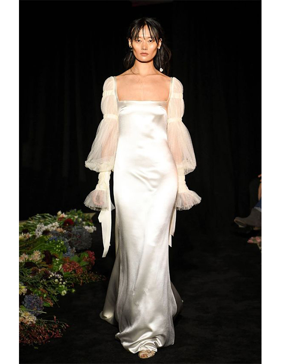As mangas – longas ou curtas, volumosas ou justas, largas, saindo do ombro ou fora deles- serão as grandes atrações no vestido de noiva em 2021. Elas complementam o vestido mais clean e adicionam um toque final a qualquer silhueta singela.