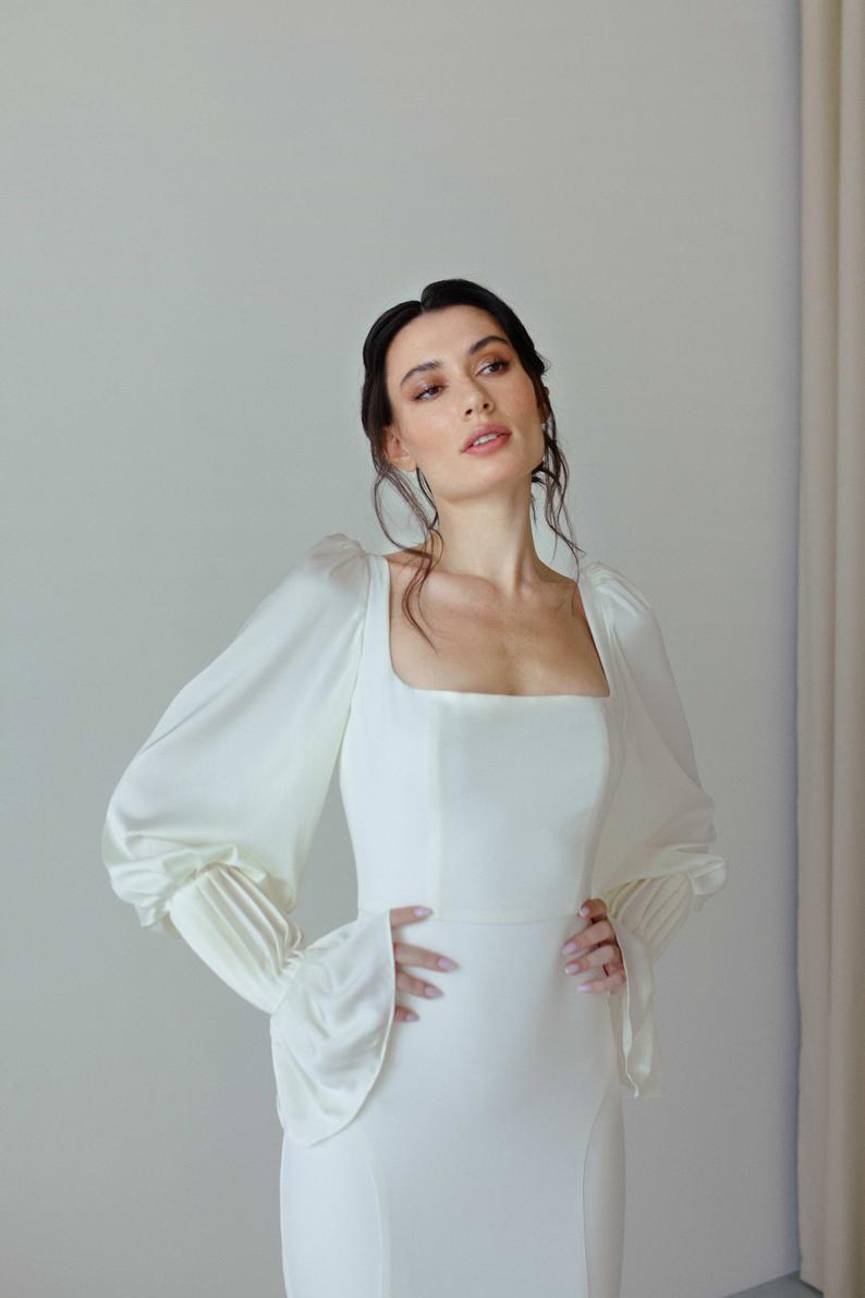–> Dica do Lápis: fique de olho nas mangas Bispo, mais longas, fluída, franzida no punho, podendo ser presa ou solta ou mais sequinha, que são super românticas e versáteis, funciona com vestido de noiva moderno, boho ou clássico.