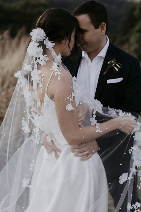 Véus longos e cheios embelezados com bordados, personalizados e sob medida serão o foco do look da noiva. Eles incluem iniciais com monogramas, emblemas, símbolos específicos, mensagens secretas –como frases ou trechos de poemas- ou as flores favoritas da noiva bordadas em tule de seda ou 3D. O céu é o limite para embelezar ainda mais os véus.