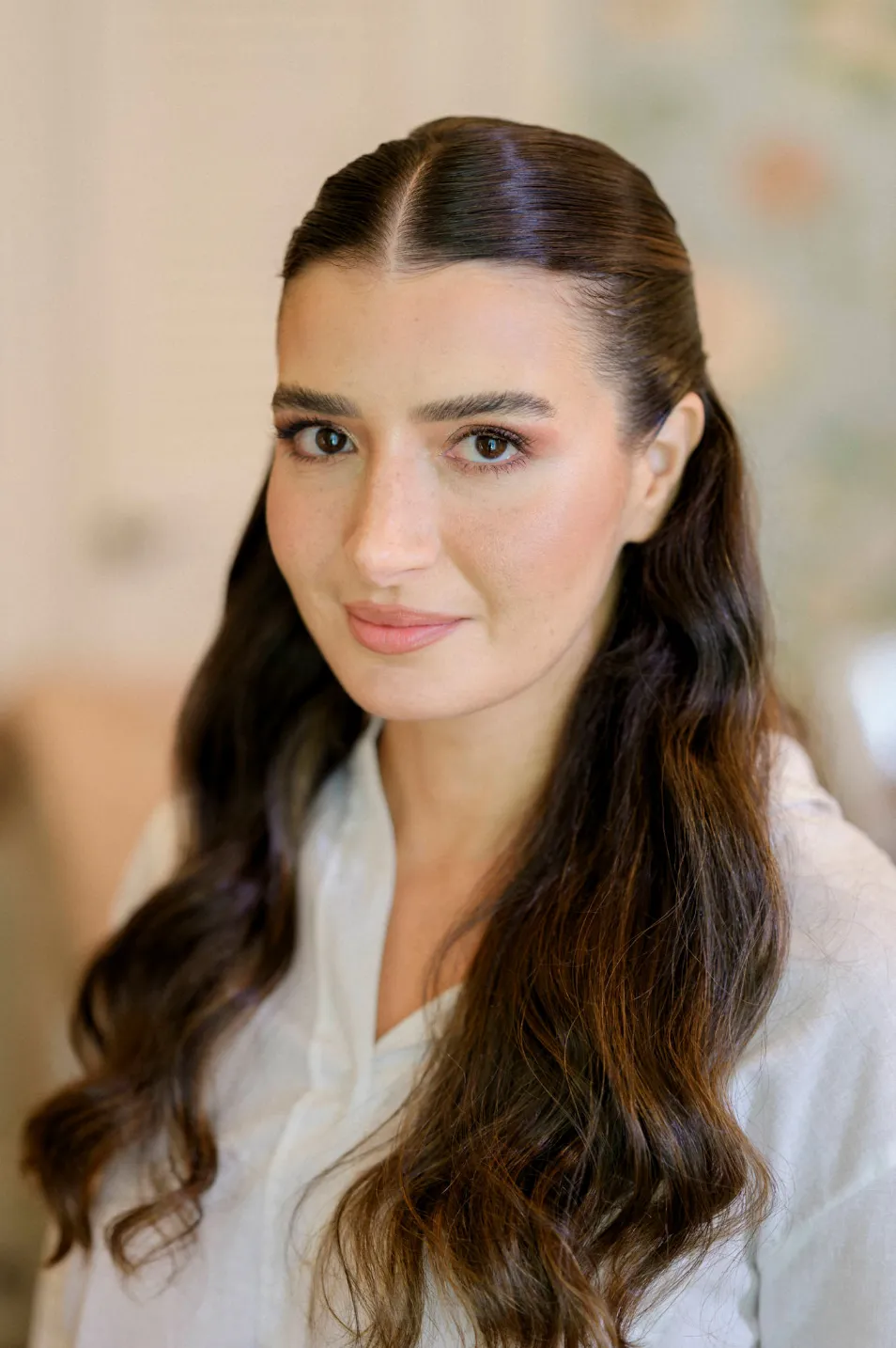 O véu, preso ao cabelo semi-preso, adicionou um toque de romantismo sem pesar o visual.