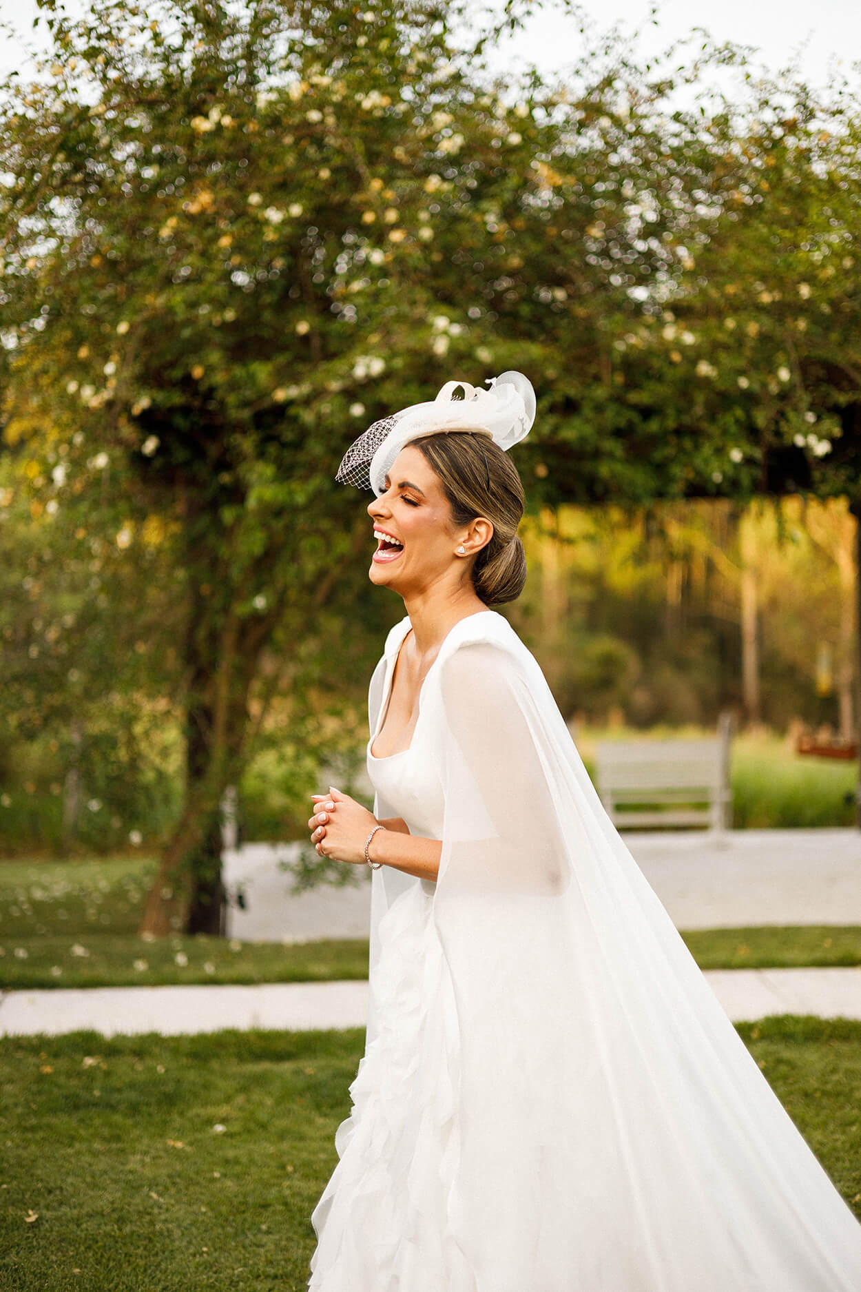 A Priscila surpreendeu as madrinhas em seu first look com esse vestido maravilhoso! O modelo é impactante com pequenos babados que dão movimento a saia juntamente com uma imponente capa. Amamos a finalização do look com esse casquete!